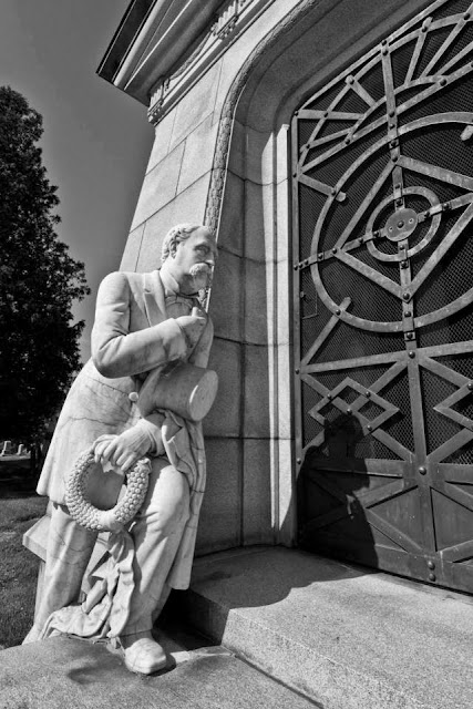 "A life size statue of Mr. Bowman is posed outside. Bent with grief, and burdened with mourning cloak, silk hat, gloves, a huge funeral wreath, and a key, he is represented in the act of ascending the steps of the tomb."