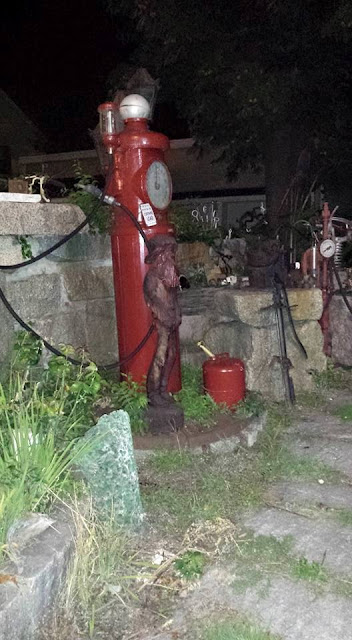Winding up a busy day, Anita had planned one more stop for me. We jumped in the car, and headed toward the Salem Ferry. Our destination (unknown to me) was Mackey's Metal Sculpture Park, and is considered one of the underground stops in Salem. It is located at 10 Blaney Street, right before you head to the dock to catch the Ferry. Unfortunately, it was dark, but I snapped a bunch of pictures, anyway. I do hope to return in the daylight, as I think it would be well worth another trip. From what I could see, Herb Mackey certainly made art out of a variety of items and it appears he had fun doing it.